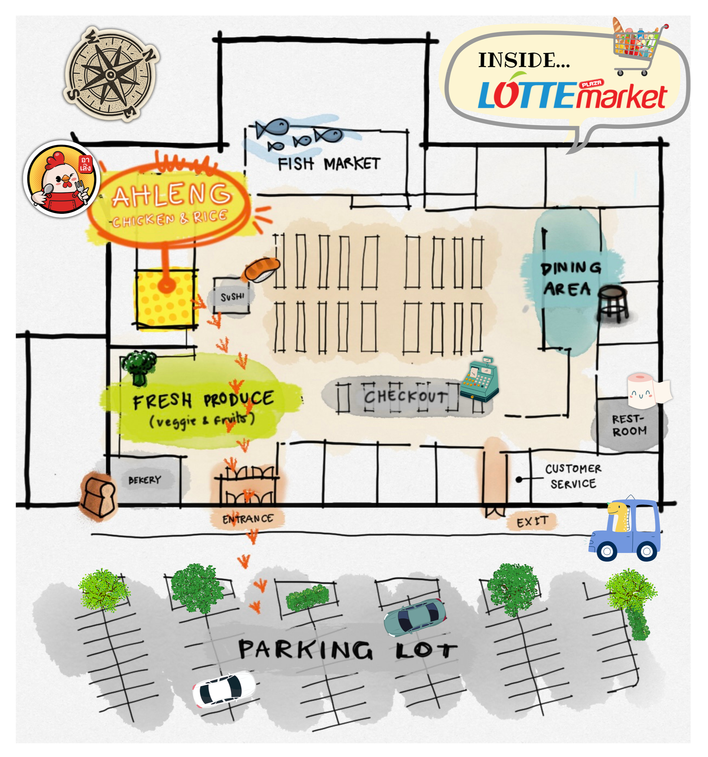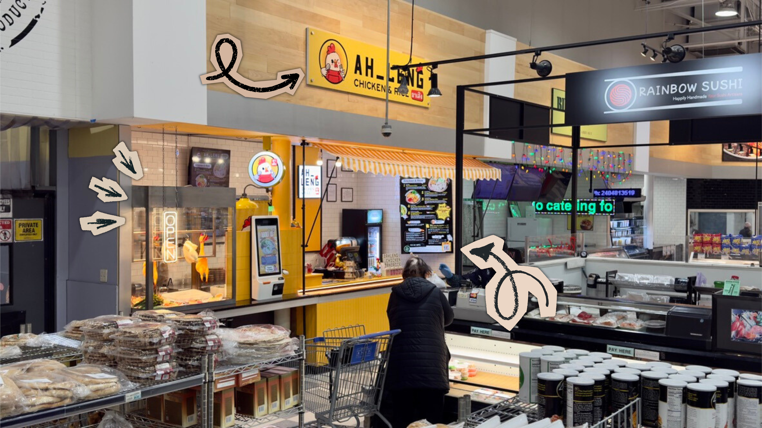 Ah Leng is located right next to the sushi counter. Look for our yellow storefront with the “Ah Leng” sign above it.
